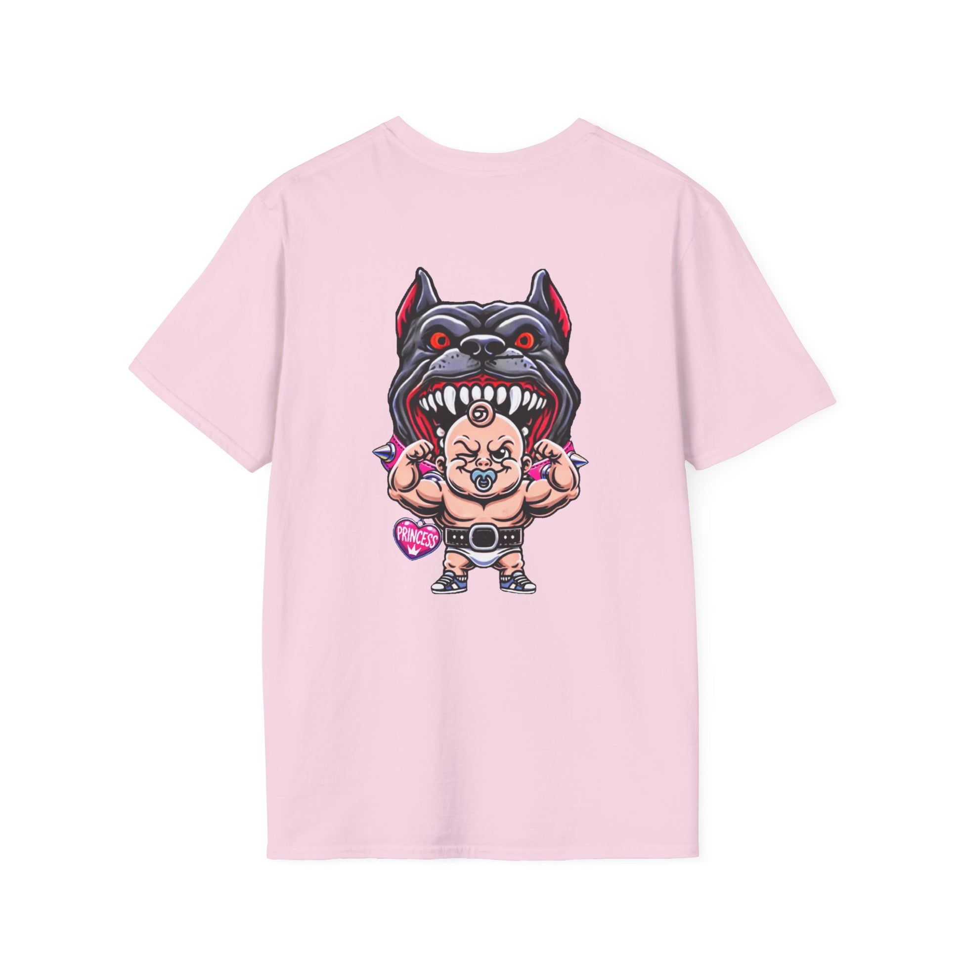 A funny T-shirt featuring a buff toddler within biting distance of a scary looking pitbull named Princess. Perfect for those who enjoy humor and unique designs. Ideal for casual wear or as a conversation starter at the gym.