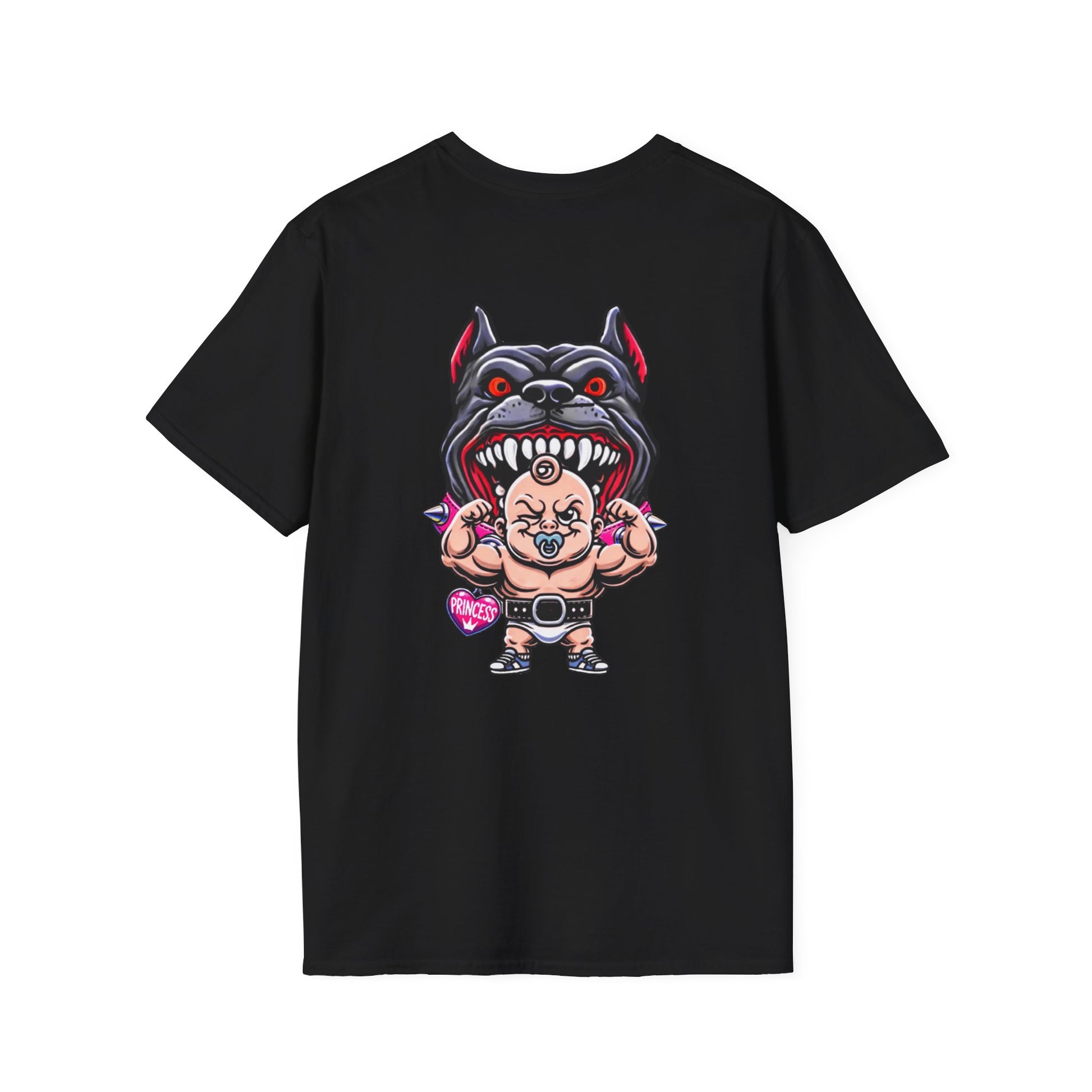 A funny T-shirt featuring a buff toddler within biting distance of a scary looking pitbull named Princess. Perfect for those who enjoy humor and unique designs. Ideal for casual wear or as a conversation starter at the gym.